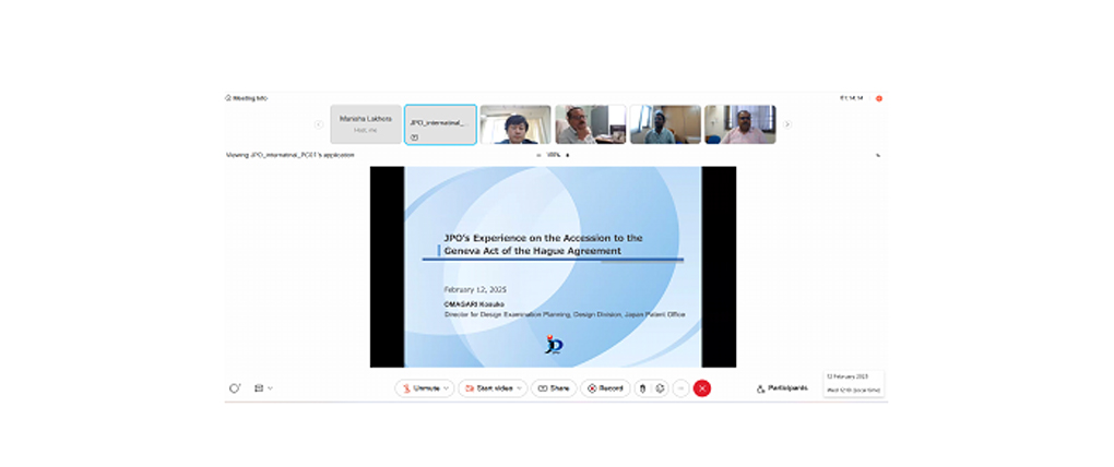 The cooperative program on Best Practices Exchange in Design Examination was conducted virtually on February 12, 2025, from 11:00 a.m. to 1:30 p.m. (IST) between Japan Patent Office (JPO) and O/o. CGPDTM.